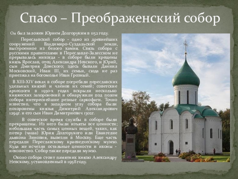 Переславский собор - одно из древнейших сооружений Владимиро-Суздальской земли, выстроенное из белого камня. Связь собора с русскими правителями в Переславле-Залесском не прерывалась никогда - в соборе были крещены князь Ярослав, отец Александра Невского, и Юрий, сын Дмитрия Донского; здесь бывали Даниил Московский, Иван III, их семьи, сюда не раз приезжал на богомолье Иван Грозный.