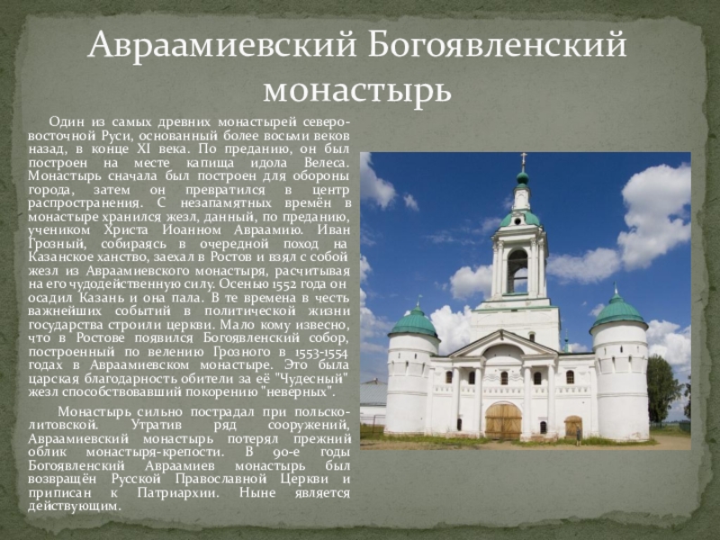 культуры. Классикой не только русского, но и мирового искусства стали архитектурные памятники Ростова, в частности постройки бывшего Архиерейского дома XVII в. — Ростовский кремль. Большую ценность представляет каменная и деревянная застройка города XVIII—XX вв. Достоянием мировой культуры являются Знаменитая Ростовская звонница XVII—XIX вв. На западной окраине города, на берегу озера Неро, расположен красивейший ансамбль Спасо-Яковлевского монастыря. Панорама Спасо-Яковлевского монастыря производит впечатление сказочного чудо-города. Авраамиев Богоявленский монастырь — основан в половине XI века преподобным Аврамием Ростовским.