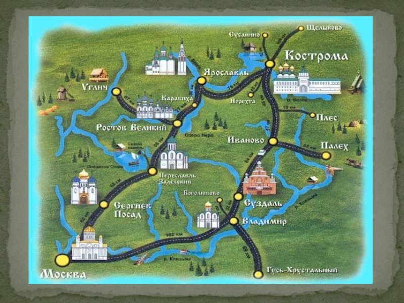В число наиболее ярких и колоритных городов региона входят: Сергиев-Посад, Переславль-Залесский, Ростов Великий, Ярославль, Кострома, Суздаль, Владимир, Иваново. Эти и другие города, соединяясь дорогами, выстраивают символический круг – от того и возникло изящное название, «Золотое кольцо». При этом каждый город может гордиться своей неповторимой историей, насчитывающей несколько веков. Несметное количество православных монастырей, святынь и храмов, расположенных в данном регионе, притягивает большое число паломников. Район Золотого кольца богат произведениями народного искусства. В музеях вашему взору предложены образцы старинных художественных промыслов: изделия искусных кружевниц и ювелиров, лаковая миниатюра и живопись по эмали (финифть), резьба по дереву и кости.