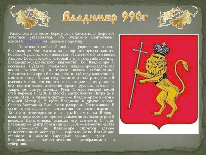 Клязьмы. В Тверской летописи указывается, что Владимир Святославич основал Владимир на Клязьме в 990 году.