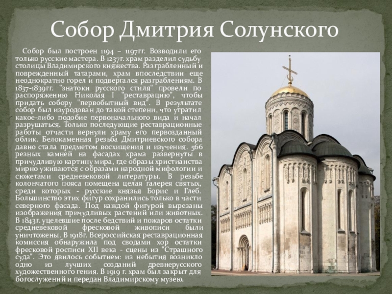 1194 – 1197гг. Возводили его только русские мастера. В 1237г. храм разделил судьбу столицы Владимирского княжества. Разграбленный и поврежденный татарами, храм впоследствии еще неоднократно горел и подвергался разграблениям. В 1837-1839гг. "знатоки русского стиля" провели по распоряжению Николая I "реставрацию", чтобы придать собору "первобытный вид". В результате собор был изуродован до такой степени, что утратил какое-либо подобие первоначального вида и начал разрушаться. Только последующие реставрационные работы отчасти вернули храму его первозданный облик. Белокаменная резьба Дмитриевского собора давно стала предметом восхищения и изучения. 566 резных камней на фасадах храма развернуты в причудливую картину мира, где образы христианства мирно уживаются с образами народной мифологии и сюжетами средневековой литературы. В резьбе колончатого пояса помещена целая галерея святых, среди которых - русские князья Борис и Глеб. Большинство этих фигур сохранились только в части северного фасада. Под каждой фигурой вырезаны изображения причудливых растений или животных. В 1843г. уцелевшие после бедствий и пожаров остатки средневековой фресковой живописи были уничтожены. В 1918г. Всероссийская реставрационная комиссия обнаружила под сводами хор остатки фресковой росписи XII века - сцены из "Страшного суда". Это явилось событием: из небытия возникло одно из лучших созданий древнерусского художественного гения. В 1919 г. храм был закрыт для богослужений и передан Владимирскому музею.
