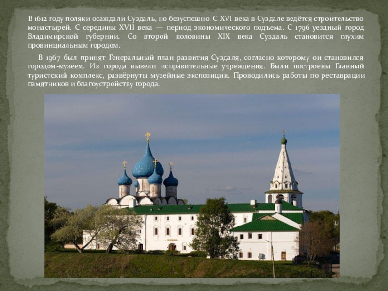 С XVI века в Суздале ведётся строительство монастырей. С середины XVII века — период экономического подъема. С 1796 уездный город Владимирской губернии. Со второй половины XIX века Суздаль становится глухим провинциальным городом.