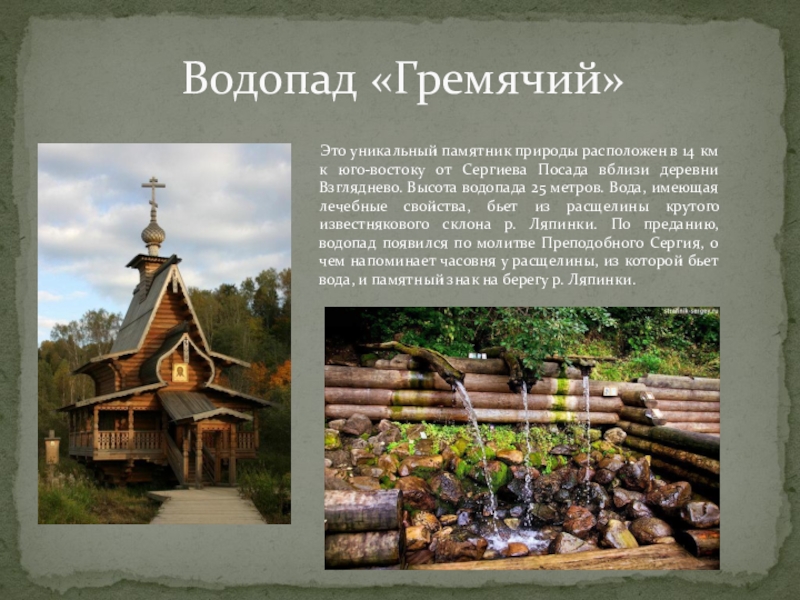 природы расположен в 14 км к юго-востоку от Сергиева Посада вблизи деревни Взгляднево. Высота водопада 25 метров. Вода, имеющая лечебные свойства, бьет из расщелины крутого известнякового склона р. Ляпинки. По преданию, водопад появился по молитве Преподобного Сергия, о чем напоминает часовня у расщелины, из которой бьет вода, и памятный знак на берегу р. Ляпинки.