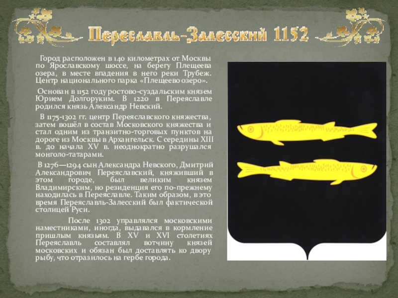 После 1302 управлялся московскими наместниками, иногда, выдавался в кормление пришлым князьям. В XV и XVI столетиях Переяславль составлял вотчину князей московских и обязан был доставлять ко двору рыбу, что отразилось на гербе города.