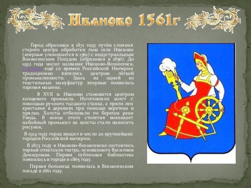 старого центра обработки льна села Иваново (впервые упоминается в 1561) с индустриальным Вознесенским Посадом (образован в 1856). До 1932 года носил название Иваново-Вознесенск. Иваново ещё со времен Российской Империи традиционно являлось центром лёгкой промышленности. Здесь на одной из текстильных мануфактур впервые появилась паровая машина.