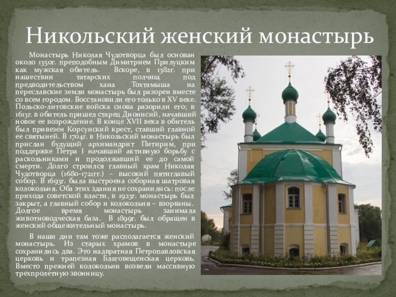 около 1350г. преподобным Димитрием Прилуцким как мужская обитель. Вскоре, в 1382г. при нашествии татарских полчищ под предводительством хана Тохтамыша на переславские земли монастырь был разорен вместе со всем городом. Восстановили его только в XV веке. Польско-литовские войска снова разорили его; в 1613г. в обитель пришел старец Дионисий, начавший новое ее возрождение. В конце XVII века в обитель был привезен Корсунский крест, ставший главной ее святыней. В 1704г. в Никольский монастырь был прислан будущий архимандрит Питирим, при поддержке Петра I начавший активную борьбу с раскольниками и продолжавший ее до самой смерти. Долго строился главный храм Николая Чудотворца (1680-1721гг.) – высокий пятиглавый собор. В 1693г. была выстроена соборная шатровая колокольня. Оба этих здания не сохранились: после прихода советской власти, в 1923г. монастырь был закрыт, а главный собор и колокольня – взорваны. Долгое время монастырь занимала животноводческая база. В 1899г. был обращен в женский общежительный монастырь.