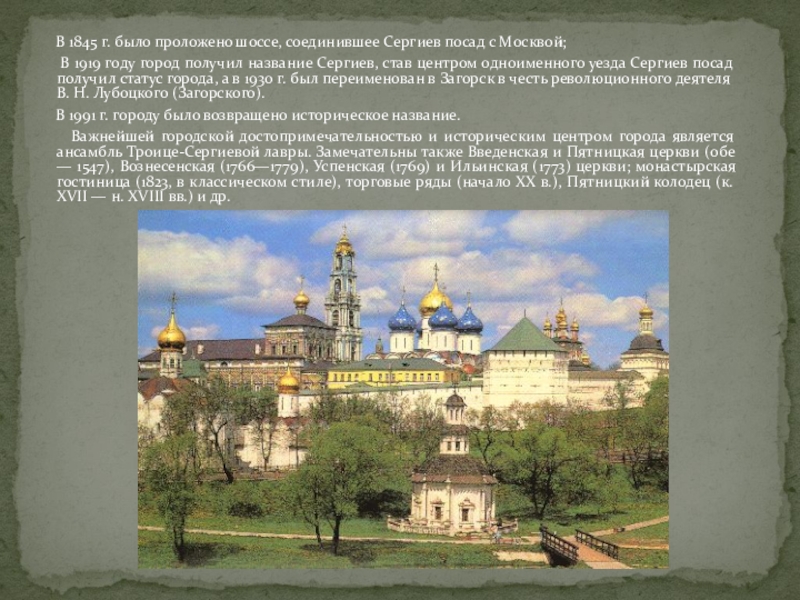 Слайд 5 В 1845 г. было проложено шоссе, соединившее Сергиев