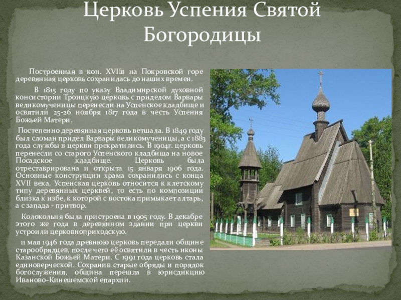 Постепенно деревянная церковь ветшала. В 1849 году был сломан придел Варвары великомученицы, а с 1883 года службы в церкви прекратились. В 1904г. церковь перенесли со старого Успенского кладбища на новое Посадское кладбище. Церковь была отреставрирована и открыта 15 января 1906 года. Основные конструкции храма сохранились с конца ХVII века. Успенская церковь относится к клетскому типу деревянных церквей, то есть по композиции близка к избе, к которой с востока примыкает алтарь, а с запада - притвор.
