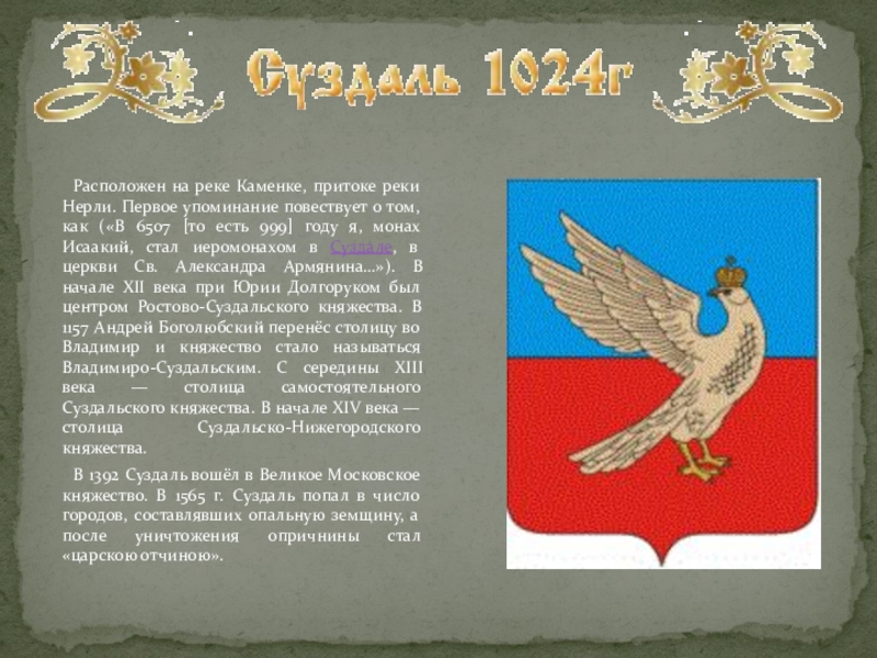 реки Нерли. Первое упоминание повествует о том, как («В 6507 [то есть 999] году я, монах Исаакий, стал иеромонахом в Суздале, в церкви Св. Александра Армянина…»). В начале XII века при Юрии Долгоруком был центром Ростово-Суздальского княжества. В 1157 Андрей Боголюбский перенёс столицу во Владимир и княжество стало называться Владимиро-Суздальским. С середины XIII века — столица самостоятельного Суздальского княжества. В начале XIV века — столица Суздальско-Нижегородского княжества.