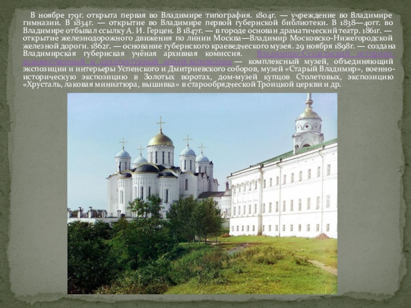 1804г. — учреждение во Владимире гимназии. В 1834г. — открытие во Владимире первой губернской библиотеки. В 1838—40гг. во Владимире отбывал ссылку А. И. Герцен. В 1847г. — в городе основан драматический театр. 1861г. — открытие железнодорожного движения по линии Москва—Владимир Московско-Нижегородской железной дороги. 1862г. — основание губернского краеведческого музея. 29 ноября 1898г. — создана Владимирская губернская учёная архивная комиссия. Владимиро-Суздальский историко-художественный и архитектурный музей-заповедник — комплексный музей, объединяющий экспозиции и интерьеры Успенского и Дмитриевского соборов, музей «Старый Владимир», военно-историческую экспозицию в Золотых воротах, дом-музей купцов Столетовых, экспозицию «Хрусталь, лаковая миниатюра, вышивка» в старообрядческой Троицкой церкви и др.