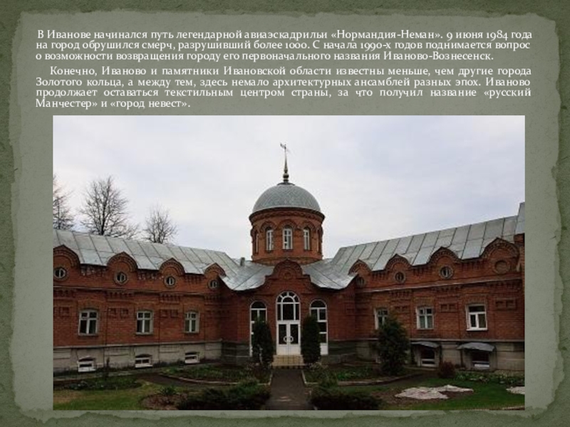 Конечно, Иваново и памятники Ивановской области известны меньше, чем другие города Золотого кольца, а между тем, здесь немало архитектурных ансамблей разных эпох. Иваново продолжает оставаться текстильным центром страны, за что получил название «русский Манчестер» и «город невест».