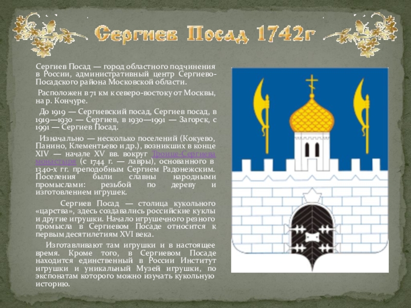 Сергиев Посад — столица кукольного «царства», здесь создавались российские куклы и другие игрушки. Начало игрушечного резного промысла в Сергиевом Посаде относится к первым десятилетиям XVI века.