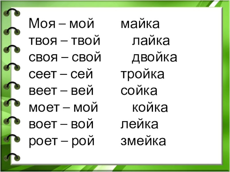 Моя – мой			майка твоя – твой			лайка своя – свой			двойка сеет – сей			тройка веет – вей			сойка моет –
