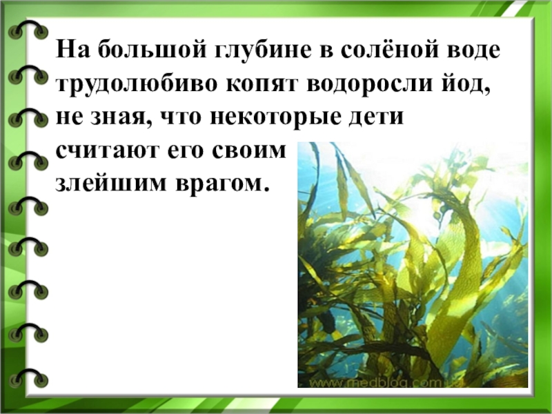На большой глубине в солёной воде трудолюбиво копят водоросли йод, не зная, что некоторые дети  считают