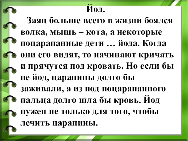 Йод. Заяц больше всего в жизни боялся волка, мышь – кота, а некоторые поцарапанные дети … йода. Когда они его видят, то начинают кричать и прячутся под кровать. Но если бы не йод, царапины долго бы заживали, а из под поцарапанного пальца долго шла бы кровь. Йод нужен не только для того, чтобы лечить царапины.