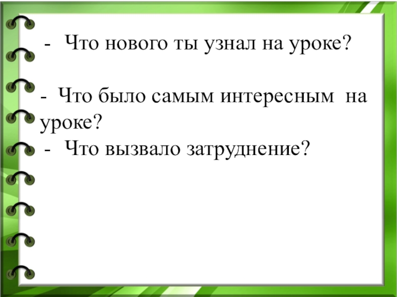 Что нового ты узнал на уроке?- Что было самым интересным на уроке?  Что вызвало затруднение?