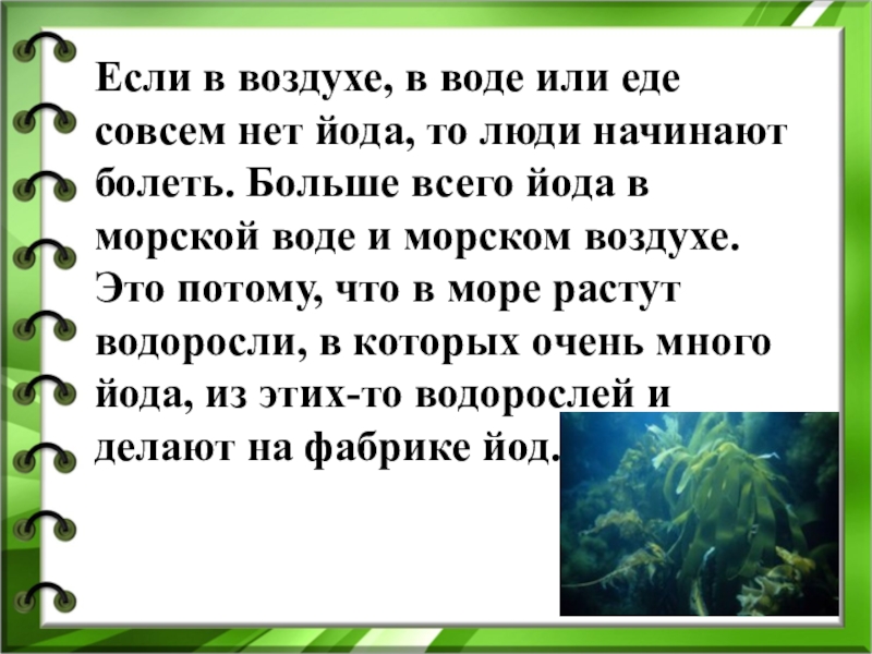 люди начинают болеть. Больше всего йода в морской воде и морском воздухе. Это потому, что в море растут водоросли, в которых очень много йода, из этих-то водорослей и делают на фабрике йод.