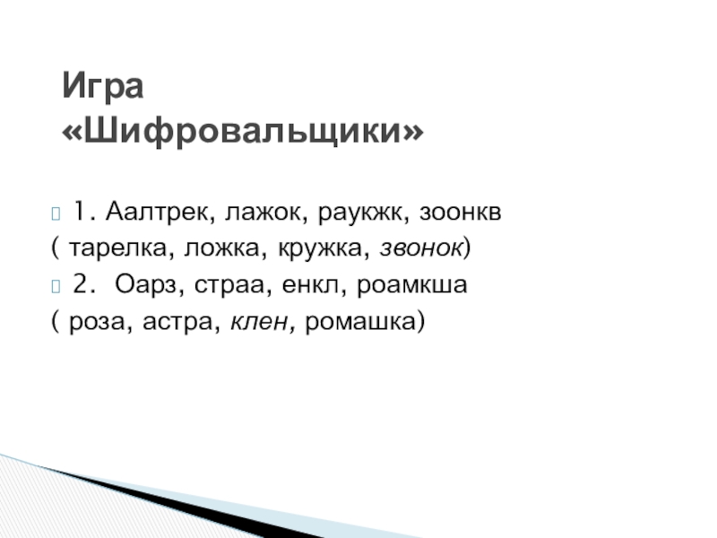 Игра  «Шифровальщики» 1. Аалтрек, лажок, раукжк, зоонкв ( тарелка, ложка, кружка, звонок) 2.	Оарз,