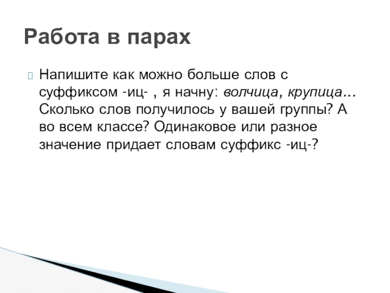 Работа в парахНапишите как можно больше слов с суффиксом -иц- , я начну: волчица, крупица...Сколько слов получилось