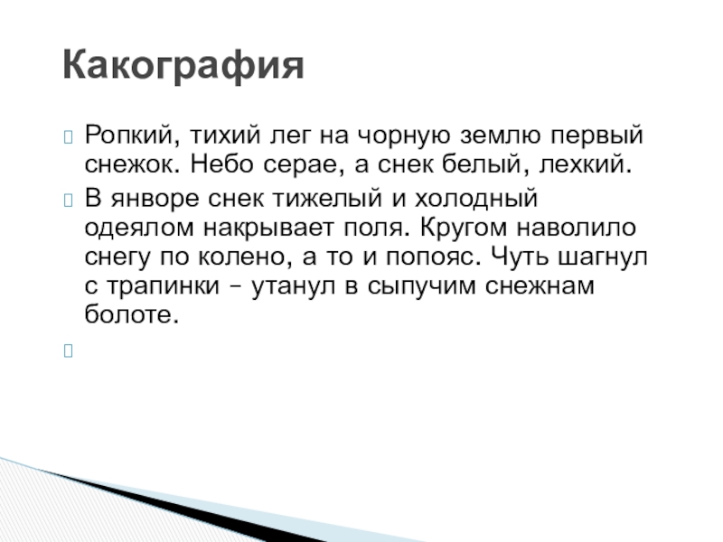 КакографияРопкий, тихий лег на чорную землю первый снежок. Небо серае, а снек белый, лехкий.В янворе снек тижелый