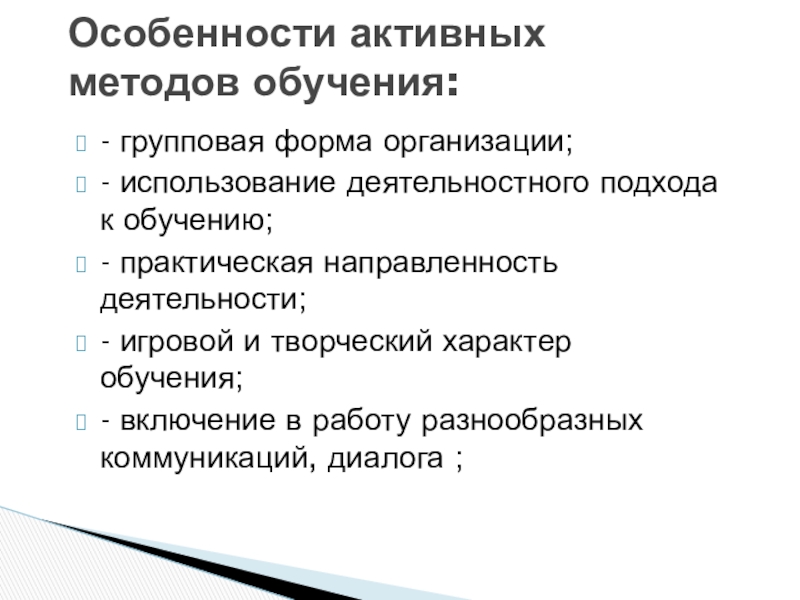 Особенности активных методов обучения:   - групповая форма организации; - использование деятельностного подхода к обучению; -