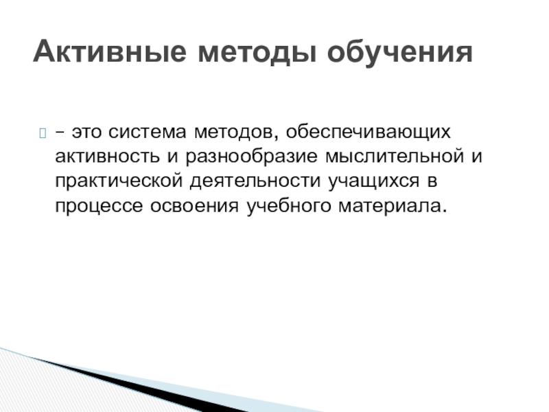 Активные методы обучения – это система методов, обеспечивающих активность и разнообразие мыслительной и практической деятельности учащихся в
