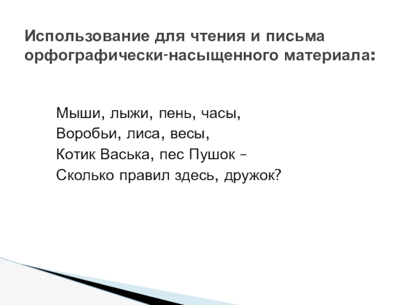 Использование для чтения и письма орфографически-насыщенного материала:Мыши, лыжи, пень, часы,Воробьи, лиса, весы,Котик Васька, пес Пушок –Сколько правил