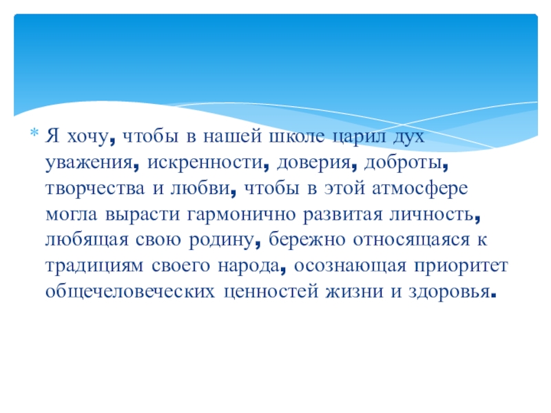 Слайд 48Я хочу, чтобы в нашей школе царил дух уважения, искренности, доверия,
