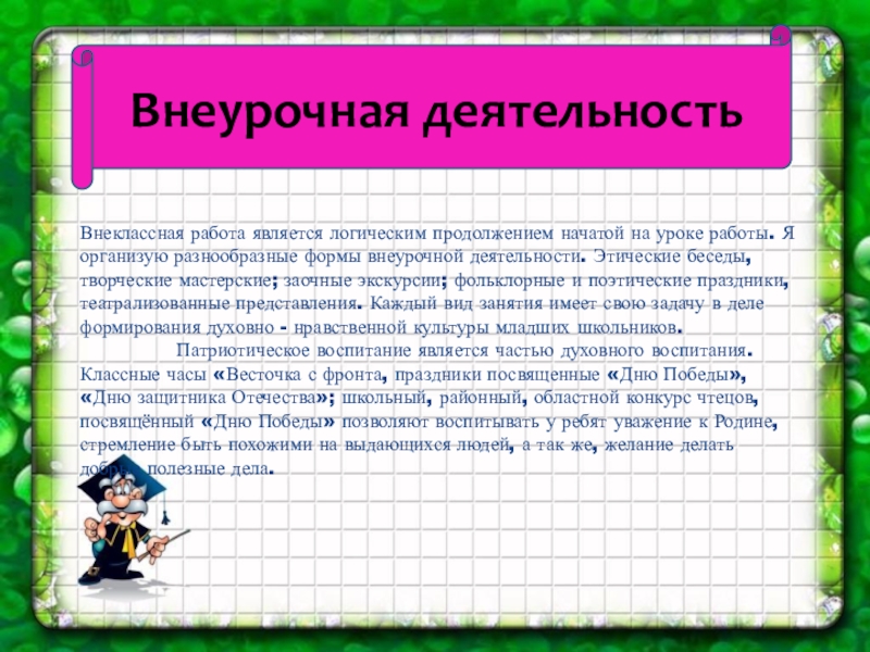 Внеклассная работа является логическим продолжением начатой на уроке работы. Я