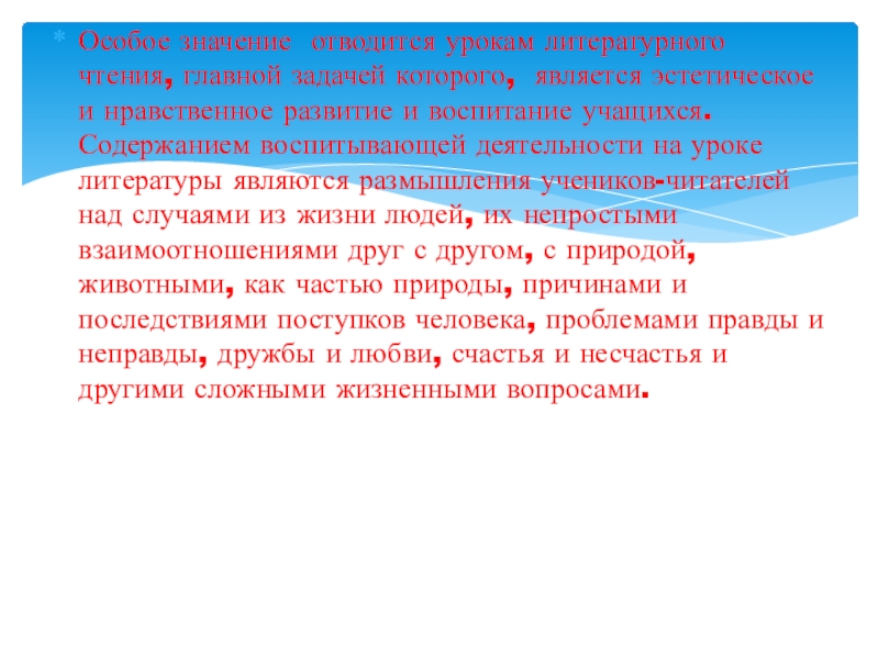 Слайд 11Особое значение отводится урокам литературного чтения, главной задачей которого, является эстетическое