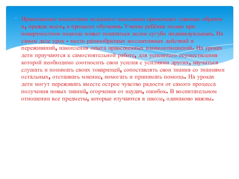 Слайд 6Нравственное воспитание младшего школьника происходит главным образом и, прежде всего, в