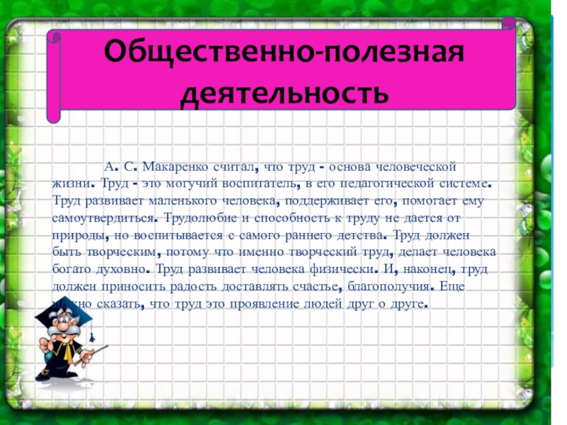 что труд - основа человеческой жизни. Труд - это могучий воспитатель, в его педагогической системе. Труд развивает маленького человека, поддерживает его, помогает ему самоутвердиться. Трудолюбие и способность к труду не дается от природы, но воспитывается с самого раннего детства. Труд должен быть творческим, потому что именно творческий труд, делает человека богато духовно. Труд развивает человека физически. И, наконец, труд должен приносить радость доставлять счастье, благополучия. Еще можно сказать, что труд это проявление людей друг о друге.