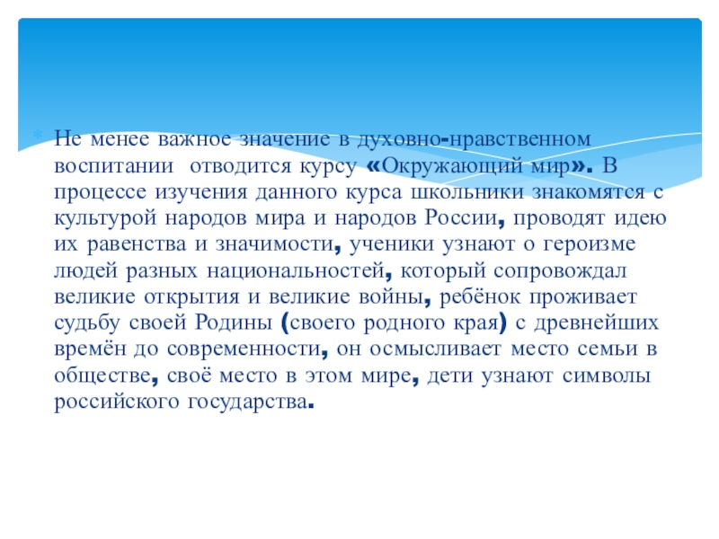 Слайд 16Не менее важное значение в духовно-нравственном воспитании отводится курсу «Окружающий мир».