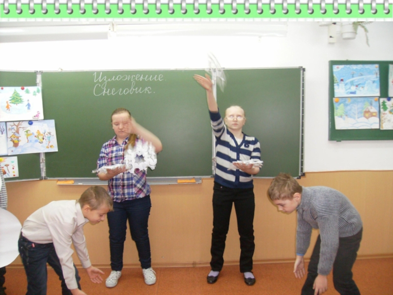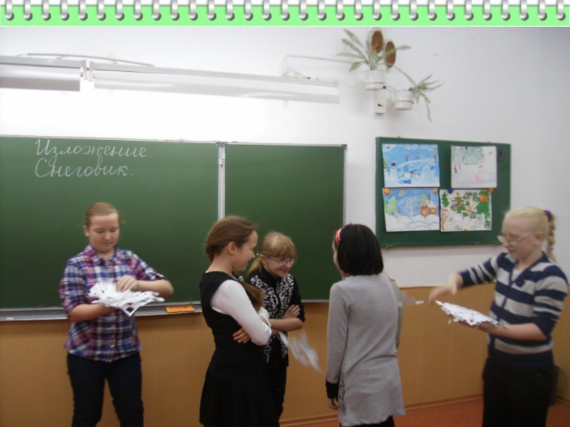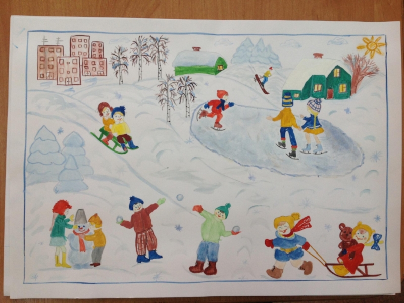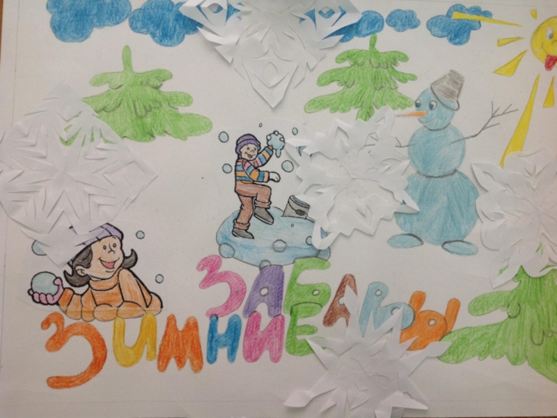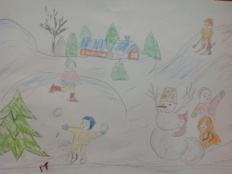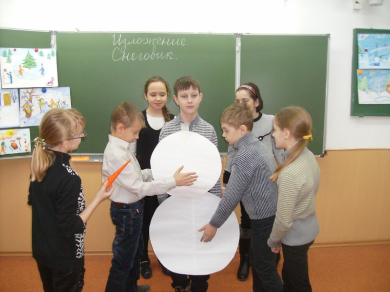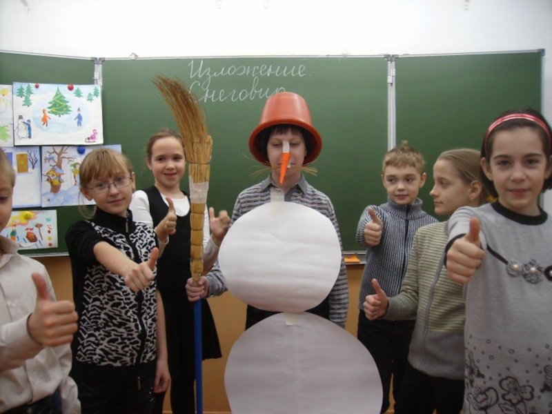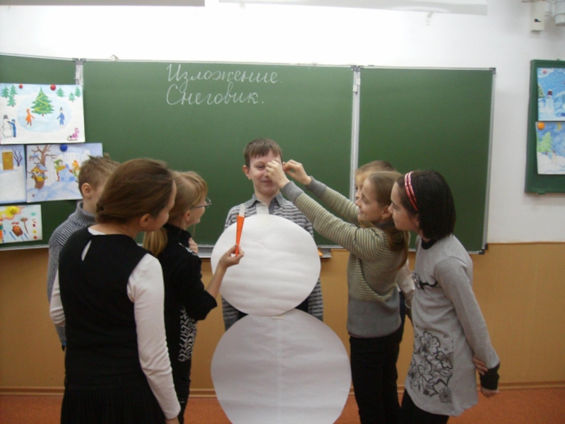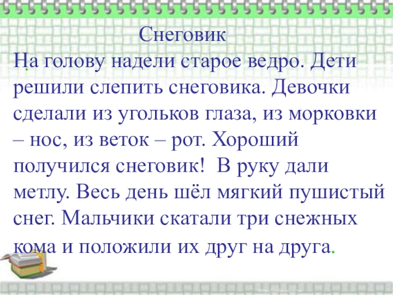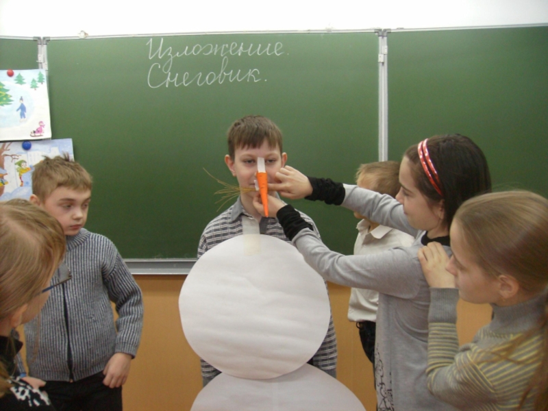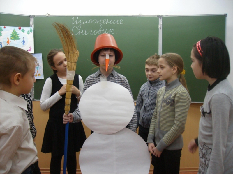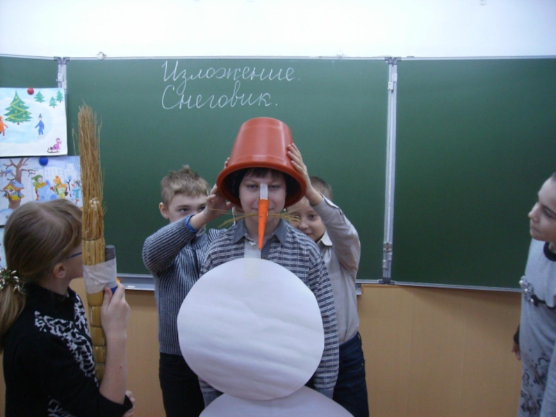 На голову надели старое ведро. Дети решили слепить снеговика. Девочки сделали из угольков глаза, из морковки – нос, из веток – рот. Хороший получился снеговик! В руку дали метлу. Весь день шёл мягкий пушистый снег. Мальчики скатали три снежных кома и положили их друг на друга.