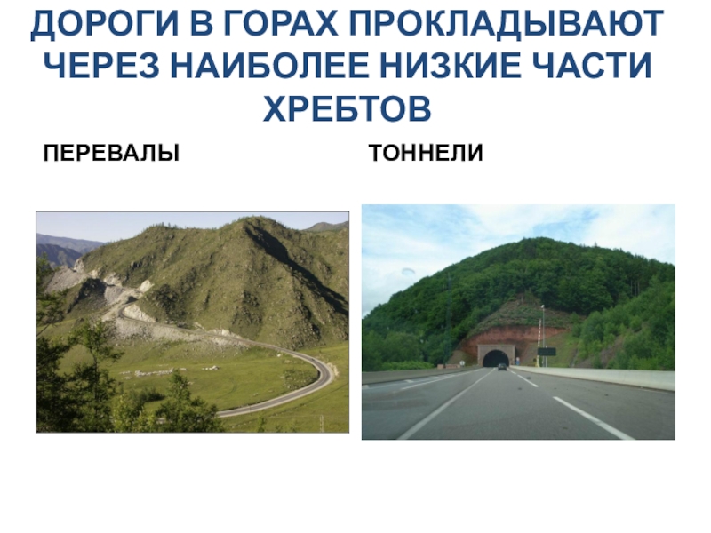 ДОРОГИ В ГОРАХ ПРОКЛАДЫВАЮТ ЧЕРЕЗ НАИБОЛЕЕ НИЗКИЕ ЧАСТИ ХРЕБТОВПЕРЕВАЛЫТОННЕЛИ