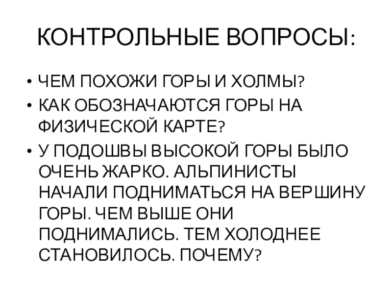 КОНТРОЛЬНЫЕ ВОПРОСЫ:ЧЕМ ПОХОЖИ ГОРЫ И ХОЛМЫ?КАК ОБОЗНАЧАЮТСЯ ГОРЫ НА ФИЗИЧЕСКОЙ КАРТЕ?У ПОДОШВЫ ВЫСОКОЙ ГОРЫ БЫЛО ОЧЕНЬ ЖАРКО.