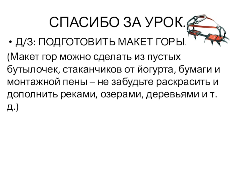 СПАСИБО ЗА УРОК.Д/З: ПОДГОТОВИТЬ МАКЕТ ГОРЫ.(Макет гор можно сделать из пустых бутылочек, стаканчиков от йогурта, бумаги и