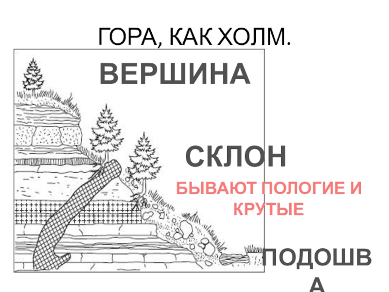 ГОРА, КАК ХОЛМ.ПОДОШВАСКЛОНВЕРШИНАБЫВАЮТ ПОЛОГИЕ И КРУТЫЕ