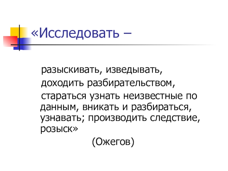 стараться узнать неизвестные по данным, вникать и разбираться, узнавать; производить следствие, розыск»