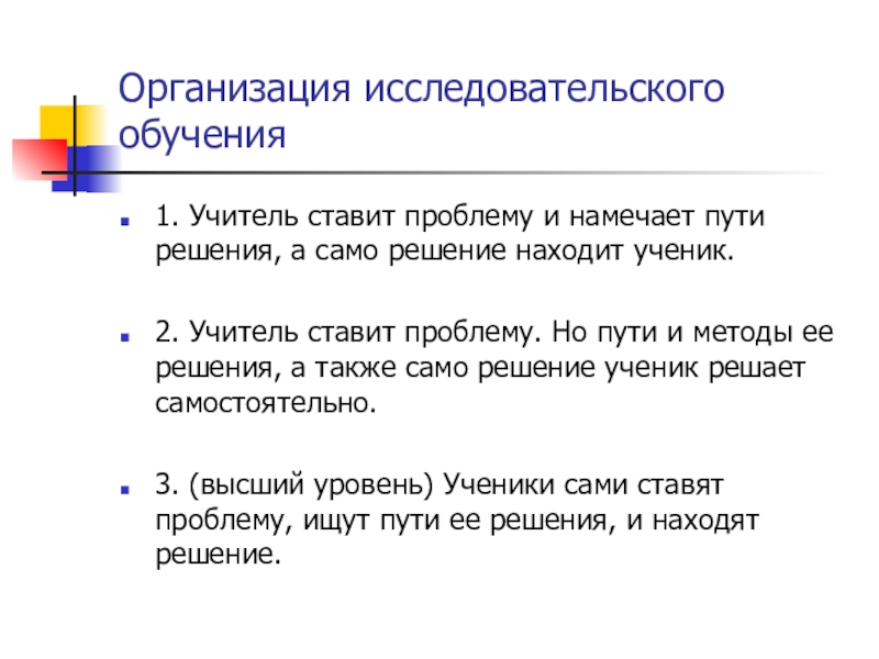 2. Учитель ставит проблему. Но пути и методы ее решения, а также само решение ученик решает самостоятельно.