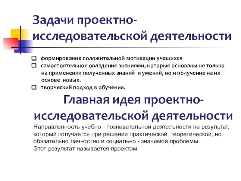 Направленность учебно - познавательной деятельности на результат, который получается при решении практической, теоретической, но обязательно личностно и социально - значимой проблемы.