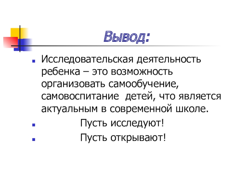 Исследовательская деятельность ребенка – это возможность организовать самообучение, самовоспитание детей, что