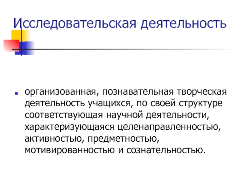 научной деятельности, характеризующаяся целенаправленностью, активностью, предметностью, мотивированностью и сознательностью.