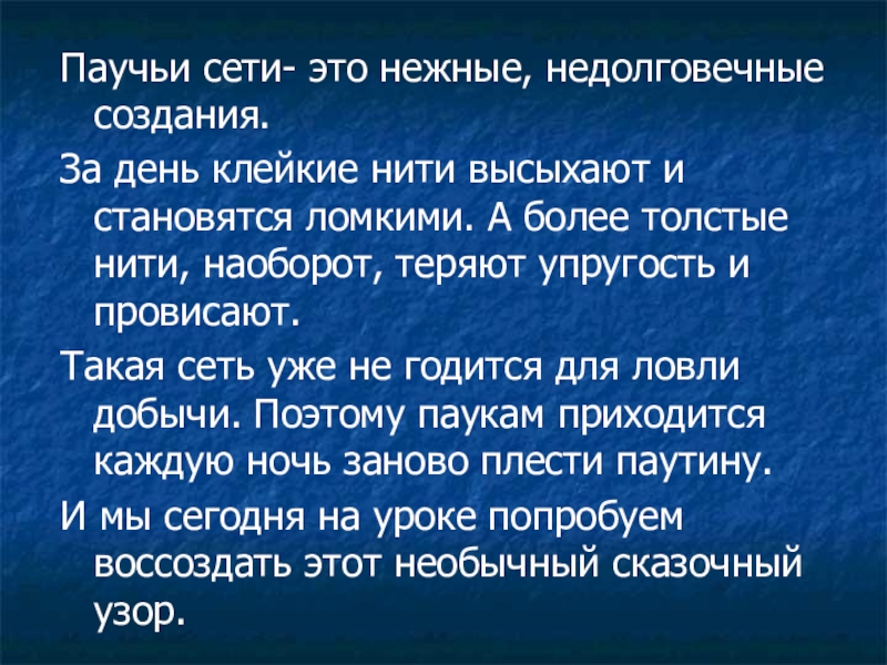 Слайд 12Паучьи сети- это нежные, недолговечные создания.