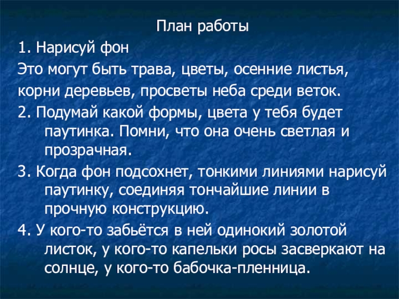 План работы1. Нарисуй фонЭто могут быть трава, цветы, осенние листья,корни деревьев, просветы неба среди веток.2. Подумай какой