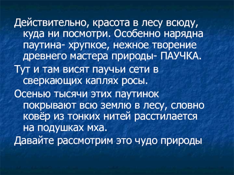 Слайд 4Действительно, красота в лесу всюду, куда ни посмотри. Особенно нарядна паутина-