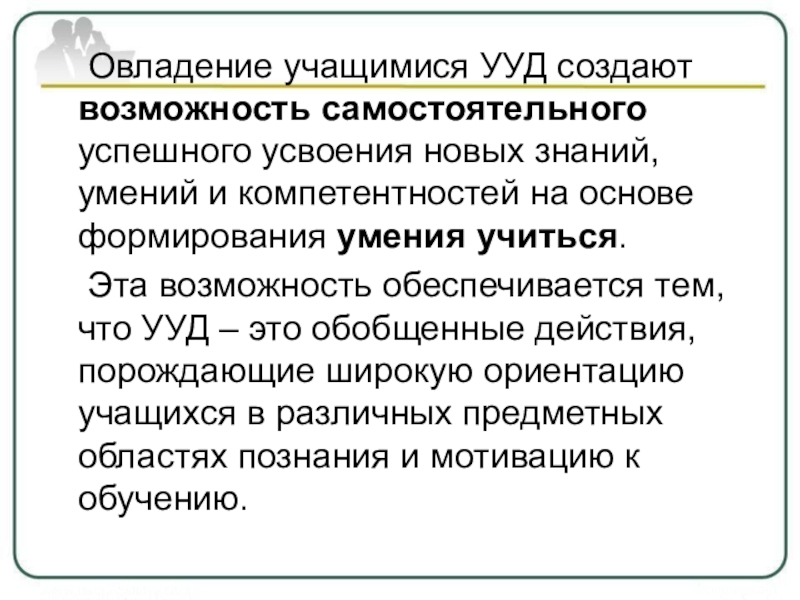 Эта возможность обеспечивается тем, что УУД – это обобщенные действия, порождающие широкую ориентацию учащихся в различных предметных областях познания и мотивацию к обучению.