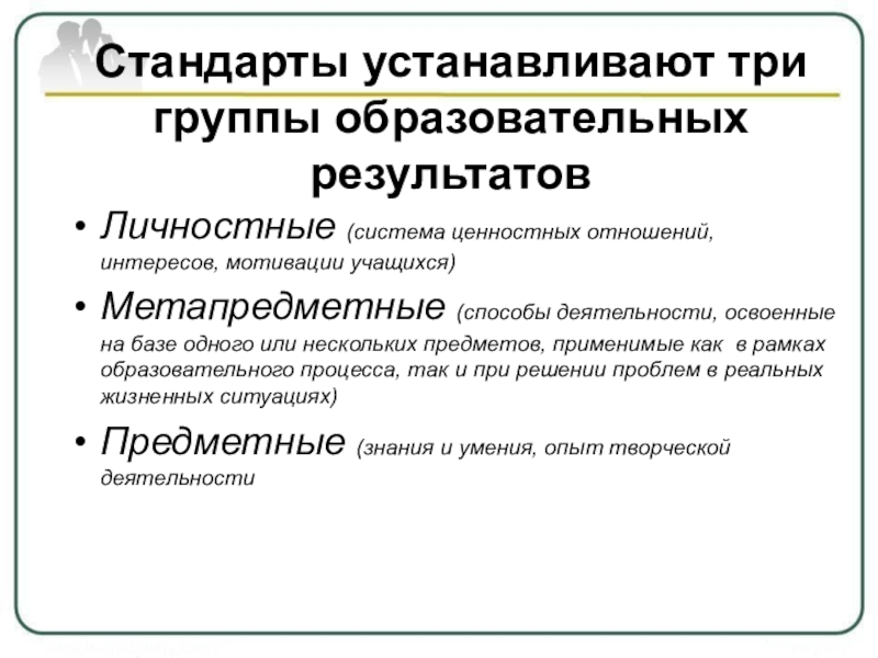 Слайд 2Стандарты устанавливают три группы образовательных результатов