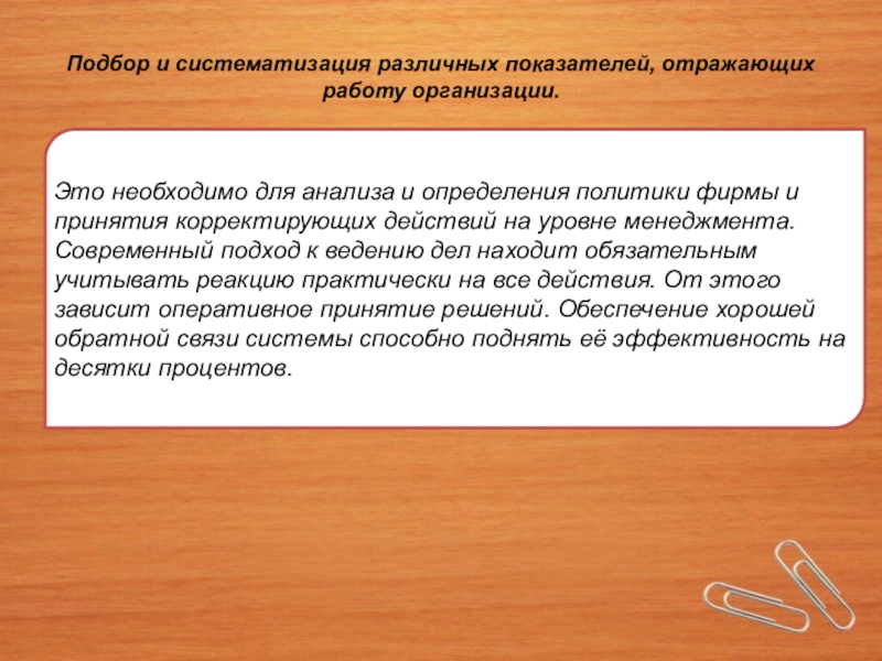 Это необходимо для анализа и определения политики фирмы и принятия корректирующих действий на уровне менеджмента. Современный подход к ведению дел находит обязательным учитывать реакцию практически на все действия. От этого зависит оперативное принятие решений. Обеспечение хорошей обратной связи системы способно поднять её эффективность на десятки процентов.