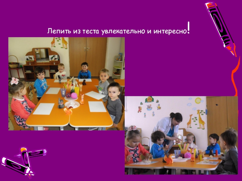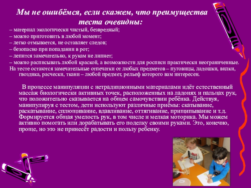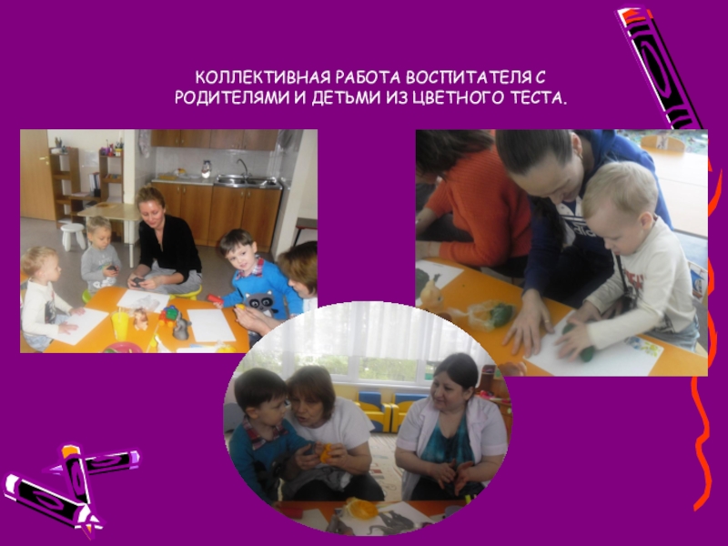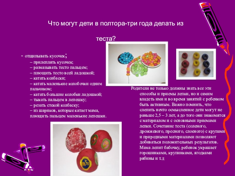 Родители не только должны знать все эти способы и приемы лепки, но и самим владеть ими и во время занятий с ребенком быть активным. Важно помнить, что слепить нечто осмысленное дети могут не раньше 2,5 – 3 лет, а до того они знакомятся с материалом и с основными приемами лепки. Сочетание теста (соленого, дрожжевого, пресного, слоеного) с крупами и природными материалами позволяют добиваться положительных результатов. Мама лепит бабочку, ребенок украшает горошинками, крупинками, ягодками рябины и т.д